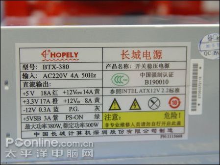 根据铭牌上标明,双动力BTX-380P4电源额定功率为300W,最大功率可以达到380W, +12V输出是分两路,一路是+12V CPU,电流是14A,是用于支持CPU供电的;另一路是+12V I/O,电流是8A,是用于支持包括硬盘、光驱等在内的I/O设备的。双路供电比普通的单路供电具有较明显的优势,可以降低CPU与硬盘等工作时的相互影响,更有利于系统的稳定性。