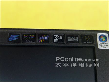 Envision G2016w面板的右上角有一行标签,显示了G2016W的大多数技术特征,即16.7万色显示,5毫秒极速响应,DCB亮彩极速,动态对比高达3000:1的丽比技术,HDCP解码,EcoMode六种亮度模式并标示其已经通过微软的VISTA操作系统认证。至于其他的性能参数如下:点距0.258mm、亮度300流明,最佳分辨率为1680*1050,垂直及水平可视角度均为160°。