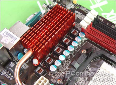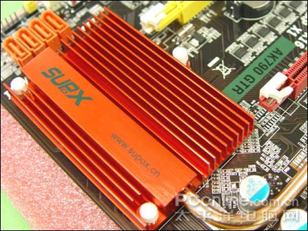 磐正超磐手 AK790 GTR主板的处理器供电部分采用四相供电设计,使用高品质的全固态电容以及半封闭式电感线圈,在MOS管上覆盖了散热片,并且使用散热导管连接至南北桥芯片的散热片,提高散热效果。