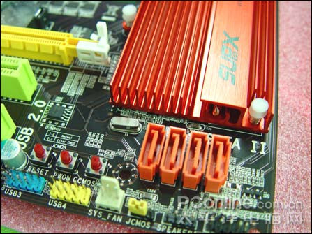 磐正超磐手 AK790 GTR主板支持ATI CrossFire交叉火力技术,两条PCI-E X16显卡插槽也被醒目的设计为主显卡红色与副显卡黄色。磐正超磐手 AK790 GTR提供4个Serial ATAII高速硬盘接口,支持SATA RAID 0/1/0+1磁盘阵列模式,并且主板提供独立的清除CMOS/开关/重启按钮。