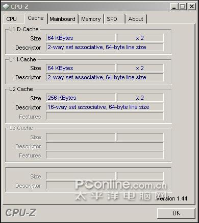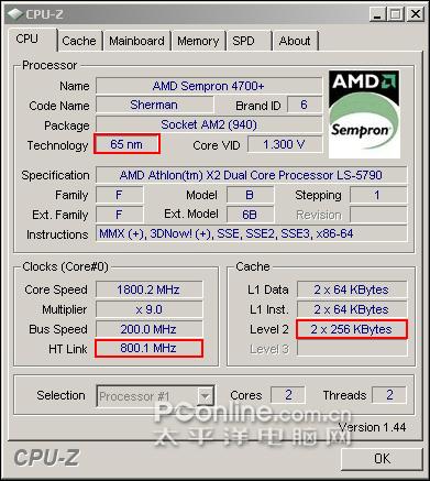 从最新版的CPU-Z 1.44显示来看,仍然还无法正确识别双核Sempron 2100+,而且将其识别成为Sempron 4700+。不过我们依然能够从CPU-Z的显示中看出Sempron 2100+同目前主流的A64 X2处理器的不同。Sempron 2100+采用65nm制程,而且二级缓存被削减至256K×2,这不免让笔者想起早先上市90nm的A64 X2 3600+(如下图所示)。但是从规格来看,Sempron 2100+和90nm 3600+仍然存在很多不同之处。其中最大的区别在于HT总线频率被降至800MHz。如果在BIOS中将HT总线强行设置成1000MHz(200×5)将无法正常开机。