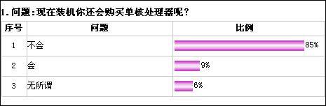 从上面这个调查表中我们不难发现,消费者在CPU的选择上已经非常理智。一款售价不足300元的入门级双核在综合性价比上完全超越了单核的同价位产品,而且成本控制问题,因此单核处理器的价格已经很难再有新的突破,也就是说单核CPU想要突破200元大关还是仍然是比较困难的。