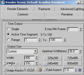 14、单击工具栏上的Render Scene Dialog(渲染场景对话框)钮打开渲染设置对话框,在Time OutPut(时间输出)选项下勾选Active Time Segment(活动时间段):0 TO 100,在OutPut Size(输出大小)项下选择Custom(自定义)设置,设置Width(宽度):400,Height(高度):300,然后再单击Render Oupput(浸染输出)选项下的Files(文件)按钮,设置渲染图像类型为AVI格式,最后按下Render(渲染)钮开始渲染吧。