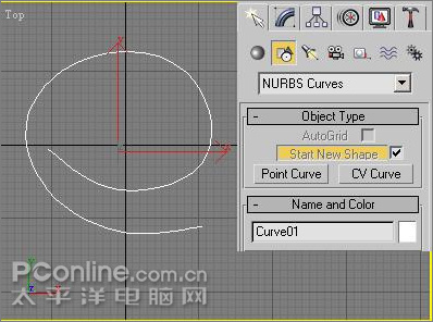 1、创建丝带舞动的路径。在制作丝带舞动片头动画之前,我们首先要在草图上简要的绘制一下想要达到的动画效果,即丝带舞动的路径,然后再开始创建。在创建命令面板中,单击Shapes(平面图形)层级,在其下拉列表中选择NURBS Curves曲线类型,在TOP视图中画出如图所示的曲线。