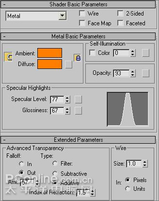11、制作丝带材质。再选择一个材质示例球,设置其材质类型为Metal(金属),Ambient(环境光)的颜色为(R:255、G:126、B:0),Diffuse(漫反射)的颜色为(R:255、G:126、B:0);self-iiiumination(自发光)的值为0;Specular Level(高光级别)的值为77,Glossiness(光泽度)的值为67;勾选Falloff(衰减)下的IN钮,设置其AMT的值为57,如下图所示。