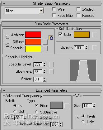 10、制作文字材质。在工具栏上单击Material Editor(材质编辑器)钮打开材质编辑器,选择一个材质示例球,设置其材质类型为Blinn,Ambient(环境光)的颜色为(R:255、G:0、B:0),Diffuse(漫反射)的颜色为(R:255、G:62、B:0),Specular(高光反射)的颜色为(R:255、G:255、B:0);self-iiiumination(自发光)的颜色为(R:201、G:152、B:0);Specular Level(高光级别)的值为253,Glossiness(光泽度)的值为33,Soften(柔化)的值为0.1;勾选Falloff(衰减)下的In钮,设置其AMT的值为86,将设置好的材质指定给场景中的文字,如下图所示。