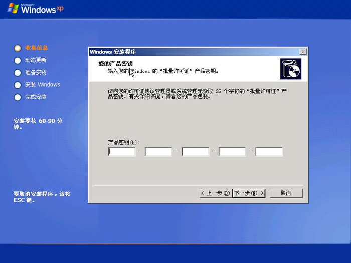 第二遍安装:吸取上面的经验,在加载iso后,拔出U盘(在拔出前,先运行虚拟光驱,因为虽然 PE可以脱离U盘运行,但作为外置程序的虚拟光驱程序还在U盘上;但这是虚拟光驱已运行,U盘是不能正常退出的,只能强行拔出,同时已证实虚拟光驱运行不受影响)。安装,输入序列号,默认安装,很快要求重新启动(快的不可思议),检查C盘,发现有临时文件夹,根目录下有NT的启动文件,但临时文件夹很小(小于10M)。重启,继续文字界面安装,发现要求插入光盘,而此时PE环境已逝,不可能提供虚拟光驱环境。安装失败。