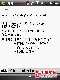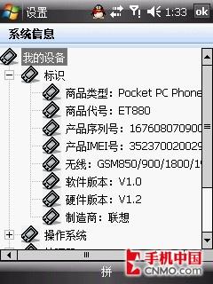 联想ET880手机并没有采用最新的Windows Mobile 6.1操作系统,仍然为Windows Mobile 6 Professional,具体版本号为CE OS 5.2.1944。该机还专门为该处理器设定了“标准”和“高性能”两种模式。标准模式时,CPU会自动调整速度,以便提高电池的续航时间;而高性能模式时,CPU会全速运行,给用户带来流畅的操作体验。