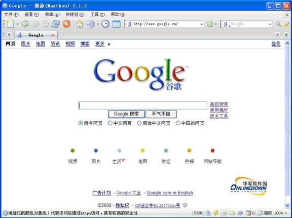 Google搜索引擎界面非常简洁,易于操作。主体部分包括一个长长的搜索框,外加两个搜索按钮、LOGO及搜索分类标签。