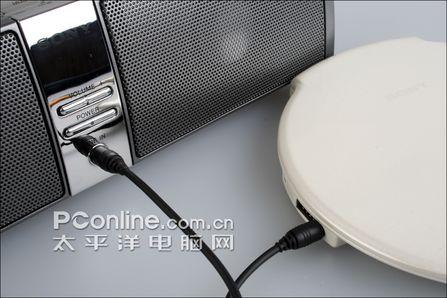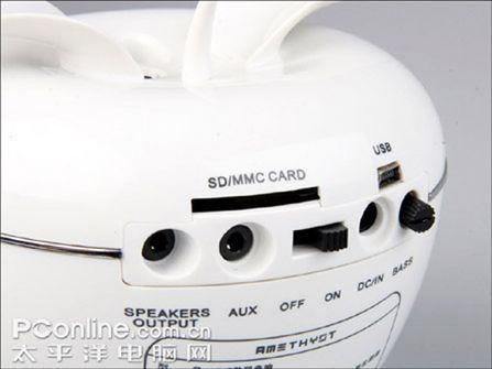 另外,S3可以作为外放音箱使用。当不插入SD/MMC卡的时候,S3也是一个独立的音箱产品。在S3的右侧,有一个AUX外部音源的输入接口,也就是可以连接其他的音源与之使用,构成一套完整的音频系统。可以连接MP3、笔记本电脑来通过S3的外放效果来听音乐,也可以连接PSP来感受更加刺激的游戏声场效果。