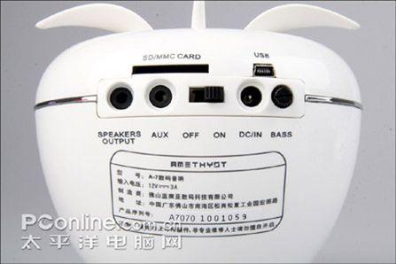 酷睿 A-7 2.1音箱还设有USB接口和SD/MMC卡插口,支持目前主流的存储卡设备。另外,用户还可以将产品与日常携带的MP3、MP4、PSP、CD、DVD、电脑、音乐手机、随身听等所有音源相连接,即使没有连接到电脑也可以轻松放歌。同时,相比其它同类音箱还具有优势的是,该音箱产品还具有智能自动开关机功能,即一段时间没有音频输入时该音箱就转休眠状态,但只要一触摸它,它马上又恢复播放状态,十分了得。