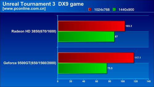 UT3的测试比较有趣,在1024x768的分辨率下,高频版9500GT居然超越了HD 3850,笔者经过3次反复测试均得到此结果,当然,在此分辨率下,两显卡均不是瓶颈所在,出现这种情况下并不奇怪,这也是众多测试中,9500GT唯一取胜的一项。但随着分辨率的提高,9500GT的处理能力显得不足了,在1440分辨率下被HD 3850轻松超越。相信随着分辨率的提高,两者差距将会更明显。