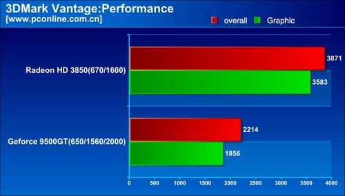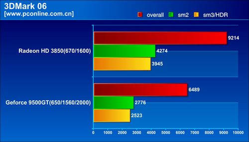 在3DMARK06的测试中,HD 3850以几乎3000分的差距领先于高频版的9500GT。