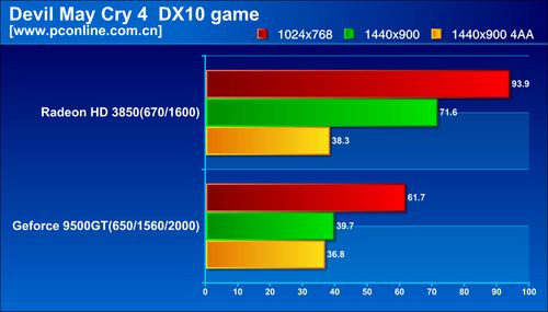鬼泣4采用的是失落星球的引擎开发的,在不开AA的情况下,HD 3850远抛9500GT,但开起AA后,差距明显减少了很多。当然40FPS进行此游戏还是可以的,但爽快感和流畅性是远不如60FPS。