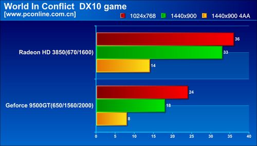 在大众化分辨中,HD 3850的表现令人很满意,基本上能流畅运行这款游戏了,而9500GT则要差不少,在测试过程的表现介于流畅与不流畅之间。