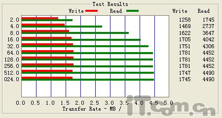 评测从员用专门的ATTO Disk Benchmarks软件测试,结果如图所示,可以看到台电X19的读取速度为最高4.4MbS,而写速度最高不到2MbS,这样速度只能说是一般水平吧。