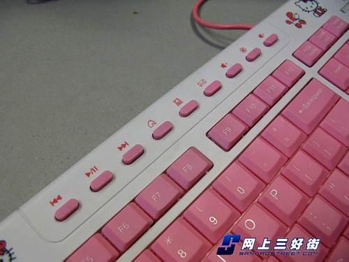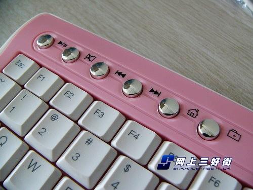 另外,在键盘顶端还设置有九个常用的快捷键,分别默认对应前进、播放 / 暂停、后退、主页、收藏夹,以及邮件、声音控制等功能。粉色圆形的快捷按键在白色边框的衬托之下十分抢眼,在极大程度的方便了消费者的日常应用,还为键盘本身添加了一抹亮色。