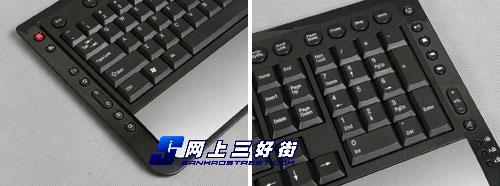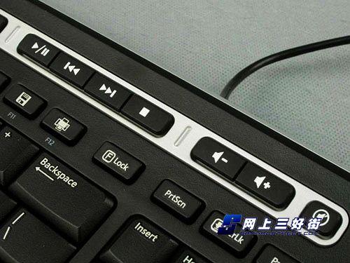 按键部分,数码多媒体3000除了传统按键以外还拥有着大量的多媒体快捷键以及自定义快捷键设计。键盘右侧配备有缩放快捷键,而左上方是Internet区域,它提供了邮件、HOME、MSN以及语音聊天的快捷键,右上方则是传统多媒体热键,比如暂停/播放、上一曲、下一曲、停止以及音量调节、静音等。除了这些常用的快捷键以外,在键盘顶部中间部分还有5个自定义快捷键,用户可以通过驱动来根据自己的应用习惯为自定义快捷键定义相应功能。值得一提的是,在键盘指示灯的左边还设有一个计算器快捷按键,用户可以通过这个快捷键迅速调出系统自带的计算器。