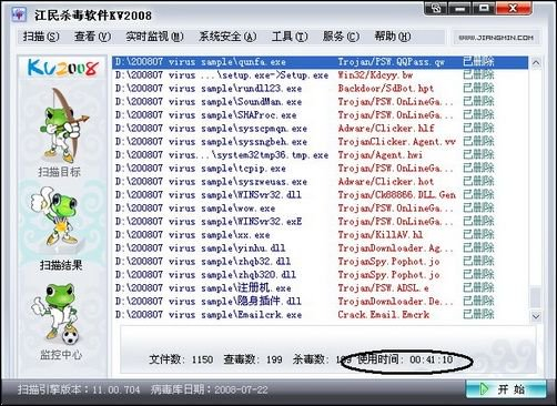 2、《金山毒霸2008》:做为国产杀毒软件三强之一的《金山毒霸》一向以扫描速度快而见长,这次比赛它第二个登场,发令声响后,它以迅雷不及掩耳盗铃之势冲向终点。2分51秒!!简直快得让人难以置信,不过时钟显示,它是本次测试中扫描速度最快的一个。默认情况下,它会先扫描恶意程序以及对内存和引导区进行扫描,如果针对某个目录进行查杀,建议用户使用右键菜单查杀,这样速度会更快一些。