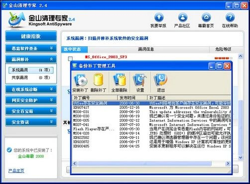 2、《金山毒霸2008》中的“金山清理专家”组件中的漏洞修复,不但能自动检测共享漏洞以及Windows 操作系统的补丁文件,还能修复IE、MS Office、WMP等应用软件的安全漏洞。笔者在测试中发现,目前危害较大的UUSEE、FLASH播放器等漏洞它也进行了修复。另外,它提供的补丁文件管理工具也非常实用,可以对所有补丁文件进行备份,免去了重装系统后重新下载补丁的麻烦(如图12)。