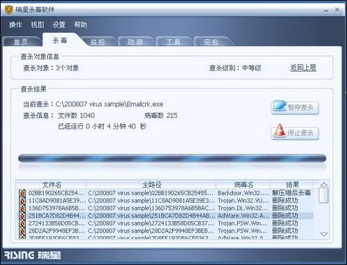 1、《瑞星杀毒软件2008》:在速度赛中表现不错的瑞星,抢先速射,也许是有些心急,400个病毒样本一共打了215环,表现只能说是尚可(如图05)。