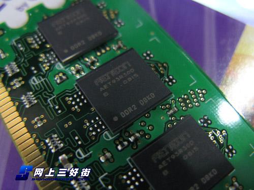 这款产品采用2×8×64MB规格,即16枚芯片双面排列,每枚芯片容量为64MB,总容量1GB。额定等效频率为667MHz,CL值不详,正是当下最具性价比的产品。赫克松集生产优势和渠道优势为一身,为这款产品提供了终身质保服务。