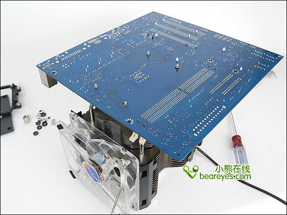 风扇装好,我们就尝试在主板上安装这个庞然大物。