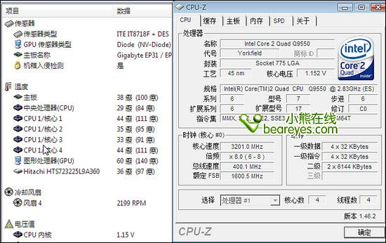 我们给Z600配备了两颗2200rpm的风扇,以测试最佳状态的成绩。下面是截取了横向测试的结果,可以看出4核心的9550满载情况下也没有超过50度,待机更是只有33度。