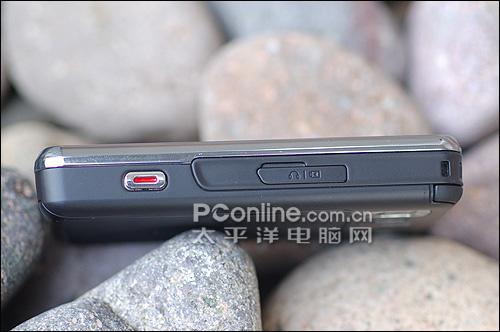 三星D988的机身右侧安置了拍照快门键与耳机/充电孔/数据线多功能插口。在往右侧的是手机挂绳孔,细心的朋友可以看出,目前主流的商务机都配搭有挂绳孔,这也从侧面说明了商务手机正在向商务与娱乐结合的方向发展。