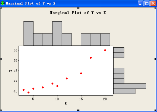 如果要比较边际图的效果,两者的差距就更大了。JMP只需在原有的报表基础上再选择Histogram Borders就能完成,结果如图三所示。它既保留了原先预测区间的特征,又能实现其中散点图与直方图之间的动态链接,Minitab则要重新从主菜单中选择Graph > Marginal Plot,重新在一个新的Graph窗口才能完成,结果如图四所示。而且可惜的是,原先预测区间的特征消失了,图形之间动态链接的效果更是从来都无法体现的。