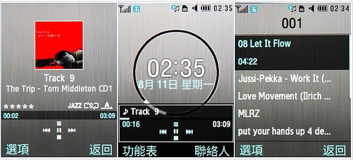 前面提到,Soul b 是 U908 开始之 Soul 系列的精神延伸,因此在接口和功能安排上,Soul b 也都是 U908 Soul 的完整风貌,是三星目前最成熟的设计展现。首先看大家很重视音乐播放器,它位在“多媒体”内,同区还有 FM 收音机和录音器。Soul b 音乐功能很丰富,管理接口是充满 iPod 味道的音乐图书馆,包括必用的歌曲清单和专辑 / 乐手 / 类型 / 排序;支持 AAC、MP3、WAV 格式,相关的播放功能则有背景最小化、重复 (单曲、全部)、随机、曲目评鉴 (打星号标示)、蓝牙 A2DP 和将音乐设置成来电或闹钟铃声等。