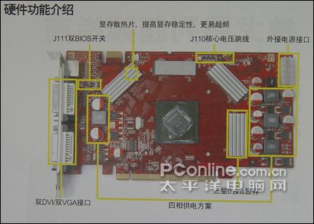 在显存部分,这款显卡搭载了三星0.8ns GDDR3显存颗粒,采用512M/256bit显存规格,默认核心/显存频率为675Mhz/2200Mhz,而公版的核心/显存频率仅有650Mhz/1800Mhz,比公版的性能提高了许多。另外该显卡采用双BIOS设计(高频率BIOS和低频率BIOS)。