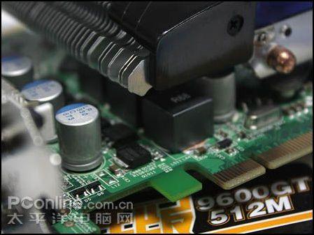 该卡做工用料相当豪华,电子线路清晰,整卡布满电子元件,全部使用高档富士通 L8 固态电容,高档陶瓷电感。显卡采用 3+1 相供电方案,核心独立三相供电,相比公版 9600GT 的两相供电,能够提供更充足的电流供应。显卡供电电路安置在显卡后部,能够大大降低电磁辐射对显卡输出信号的影响,显示更清晰。