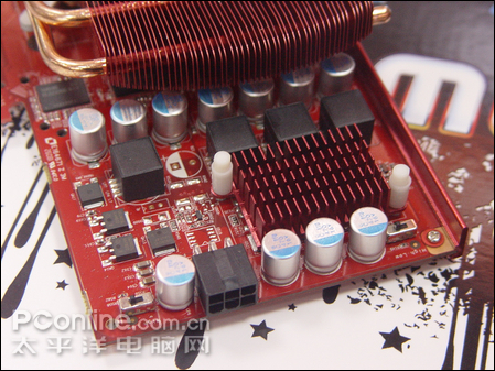 蓝宝石 HD3870 Toxic 毒药的供电部分采用了日本化工的 KZJ 固态电容,显卡整体使用 2+1 相供电设计,并且在 MOS 管上配备了散热片,加上外接 6pin 电源接口,保障显卡稳定运行在高频率之下。