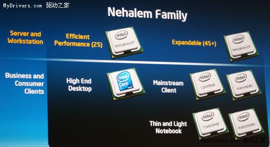 首先推向市场的是高端桌面PC处理器品牌Core i7和针对高能效服务器市场的Nehalem-EP,预计今年第四季度即可上市。随后,新架构产品将陆续推出,包括针对可扩展服务器市场的Nehalem-EX,桌面市场的Havendale和Lynnfield,移动市场的Auburndale和Clarksfield,都将在明年下半年登场。