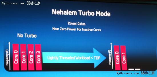 下一代Core微架构(Nehalem)处理器均将从4核起跳,但同时采用了Hyper-Threading技术,可同时处理8个线程。Core i7将支持Turbo Mode和Power Gates技术,在不需要多线程运算时,可令闲置核心完全关闭。各个核心可以工作在不同的电压/频率下,单独提高某一核心频率的Turbo Mode模式可显著提升单线程应用性能。