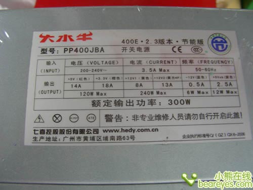 该电源的具体型号为PP400JBA,具有额定300W、最大400W的功率。0.8MM镀锌外壳,耐指纹,散热性能更强;12CM静音风扇,超大风量、超低噪音设计、自动温控设置,低于30Db;通过了多种认证,其中包括国内目前强制实行的3C认证,CE认证,中国节能认证,欧盟ROHS认证。