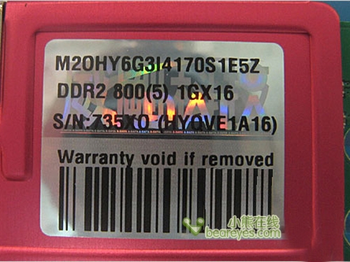 从内存标签可以看出,此内存容量为单条1GB,频率800MHz(等效于PC2-6400),默认的时序参数为5-5-5-15,内存的默认工作电压为1.8V,采用了240pin的DDR2接口规格。小编从底部看出该内存双面搭载16颗容量为128MB内存芯片,内存金手指采用化学镀金工艺,色泽纯正。在金手指上方整齐的排列着电阻,提高了内存的稳定性能。同时,威刚1GB DDR2-800内存表面粘贴有中国防伪行业协会的标签,用户可以通过短信、免费电话以及上网查询等三种方式进行真伪验证,很好的保障了消费者利益。小熊商城相应产品信息