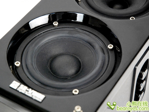 在下面还有另外一个4英寸的单元,不过这颗单元并不是同轴的了,而是我们经常见到的单元设计。这颗单元采用了纸盆振膜。另外,这两颗单元采用的是并联设计。这里就可以很好的解释为什么索威S840H不是三分频的设计了。不过,两只单元并联设计是有其道理的,对4英寸书架箱而言,能做出丰满有力的低音又能承受大的动态是相当难的一件事,为此设计者使用了线性阵列原理,良好的解决了4英寸书架箱的诸多问题,这种设计目前在结构上也只能用同轴单元来实现,因为如果用独立的高音加两个4英寸低音来组成线性阵列,箱体将会出奇的高,这对4英寸多媒体音箱是一个致命的遗憾,因为丧失了占用桌面体积小的优势。S840H的同轴单元功率为25W/只,而另外一颗低音单元的功率则为20W/只。
