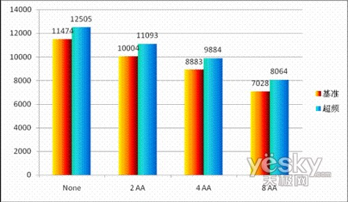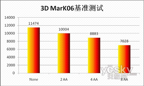 测试方法:用3DMark 06分别测试了分辩率在1024X768下None和开启2、4、8倍抗锯齿的性能检测,每种情况测试3遍,取最低值。