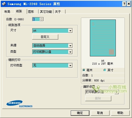 三星 ML-2241 能够兼容多种纸张,打印属性中也需要对应选择正确的纸张
