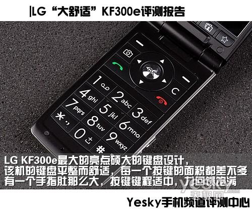 LG KF300e最大的亮点硕大的键盘设计,该机的键盘平整而舒适,每一个按键的面积都差不多有一个手指肚那么大,按键键程适中,力回馈饱满而不生硬。每一个按键标识都几乎占满了整个按键,尤其是数字键盘的按键标识,每一个数字和字母符号都清晰可见,白色而柔和的背景灯在夜晚清晰“点亮”每一个按键又不会有刺眼的感觉。