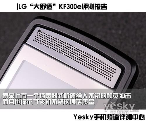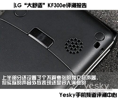 LG KF300e的扬声器设计非常简单,同心圆的独立扬声器,显得单薄而无力,但编辑在实际测试中才发现,该机的声音表现还是非常优秀的,声音音量够大,音色饱满而且穿透力十足,让用户在嘈杂环境下也不会错过电话。