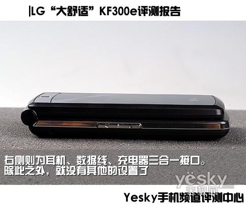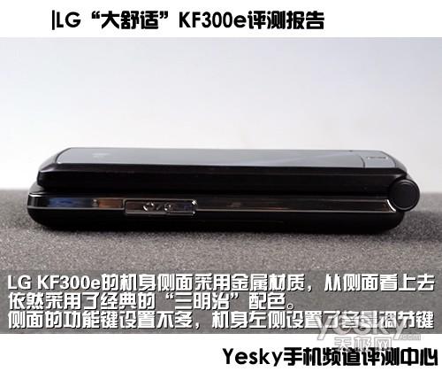 LG KF300e的机身侧面采用金属材质,从侧面看上去,依然采用了经典的“三明治”配色。侧面的功能键设置不多,机身左侧设置了音量调节键,右侧则为耳机、数据线、充电器三合一接口。除此之外,就没有其他的设置了。