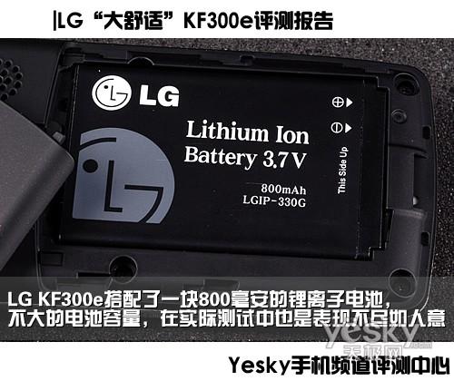 LG KF300e搭配了一块800毫安的锂离子电池,不大的电池容量,在实际测试中也是表现不尽如人意。在测试过程中,平均每天20条短信,20分钟电话,30分钟其他操作的情况下,只能坚持2天左右的时间,如果能够在电池上也采用大容量,那这款以“大”为美的手机才真正完满了。