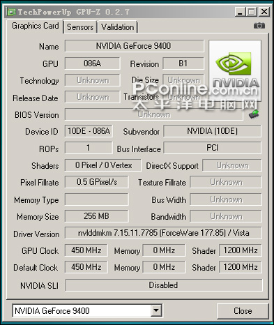 在最新的0.2.7版本GPU-Z中,我们无法取得MCP7A-U的全部信息,仅仅能够得知该B1步进的Geforce 9400显示核心频率为450Mhz,Sharder频率为1200Mhz。因此目前我们尚无法证实是否存在拥有不同数量流处理器的MCP7A芯片。