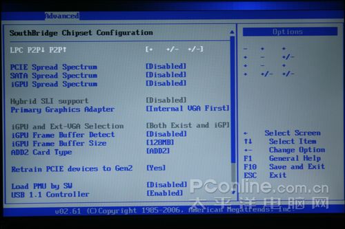 在冠盟MCP7A主板的BIOS中,我们发现“Hybrid SLI support”一栏为灰色状态,也就是用户无法开启“Hybrid SLI support”,即使插上支持Hybrid SLI 功能的Geforce 8500GT也如此。