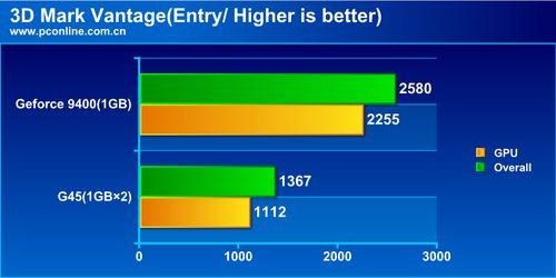对比Intel平台另一款DV10整合芯片——G45,Geforce 9400在无法使用双通道内存的情况下已经大幅度领先于前者近90%,其性能已经无愧于Intel最强整合主板的称号。