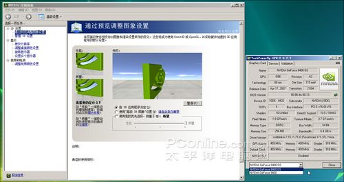 我们再进入系统看看这款MCP7A主板能否支持混合SLI。我们给主板插上Geforce 8400GS显卡,并打开主板显示核心,然后安装驱动程序、重启,结果是nVIDIA控制面板没有显示开启SLI的选项,同时GPU-Z也显示两个显示核心处于SLI Disable状态。