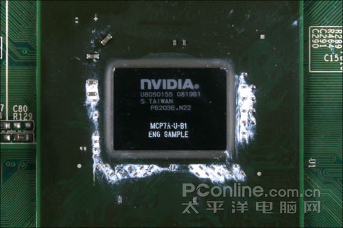 上图为一颗B1步进MCP7A-U芯片,封装日期为08年19周,也就是今年5月第三个星期,距我们收到这款主板足足隔了三个月。除了B1步进MCP7A外,还有更早推出的A1步进MCP7A和此后的B2步进MCP7A。据消息人士透露,最新的B2步进MCP7A芯片拥有更多的16个流处理器,在性能上要领先于早期的A1和B1步进MCP7A,但nVIDIA却在B2步进MCP7A上取消了对Hybrid Power和Hybrid SLI的支持。如果真的有“B2步进MCP7A”的存在,那么似乎可以解释为何早在5月份MCP7A芯片就已经完成封装,而主板却在8月下旬才打样。
